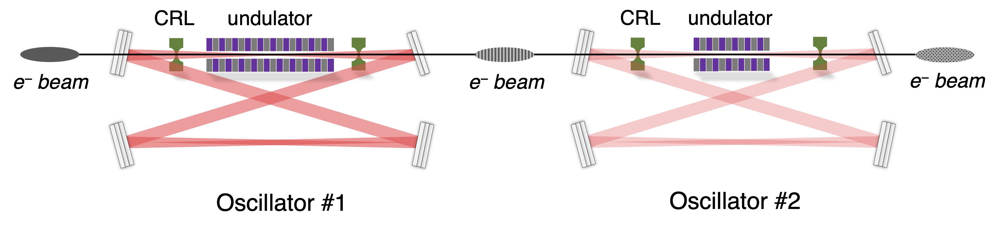 This is an interesting and ongoing topic, with original idea from (and recently collaborated with) Y. Zhang (JLab). Generating an x-ray free electron laser (FEL) requires a high brightness electron beam from a big, complex and expensive multi-GeV linear RF accelerator. To produce multiple x-ray FEL beams, the linac electron beam must be shared to enable one beam driving a single undulator. This results in low average electron current and compromised FEL performance. Recently, a concept of multiple x-ray FEL beams driven by one common electron beam was proposed, which enables substantial reduction of required equipment and improvement of productivity. In this paper, we present a simulation study to demonstrate this innovative concept could work. The system consists of two oscillator-type x-ray FEL devices arranged side-by-side and one electron beam passing through them. As such, the second, downstream x-ray FEL oscillator is driven by electron bunches already been used once while the first x-ray FEL oscillator always receives fresh electron bunches from the linac. The simulations were based on the 1-D FEL model. The study shows that lasing could be achieved for both x-ray FEL oscillators, their radiation field intensities at saturation can be comparable, thus meet demanding needs of users. The concept also enables a potential application using a circulator ring such that an oscillator can be driven alternately by fresh electron bunches from the linear accelerator and used bunches in the circulator ring.